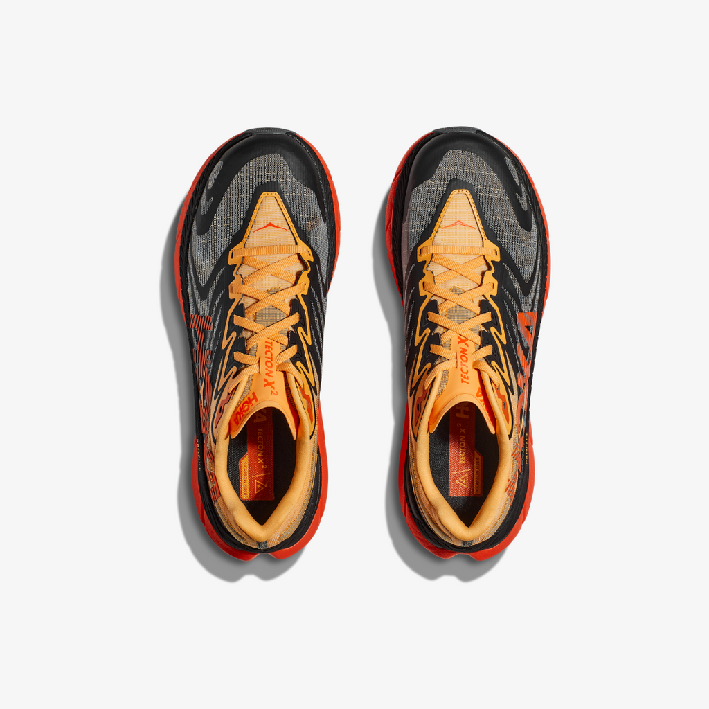 A dynamic shift in trail running. Reengineered to maximize weight savings, the Tecton X 2 has been refined with a brand new Matryx® upper. Light, breathable, and inherently hydrophobic, our high-contrast Matryx® upper enlists a lay-flat gusseted tongue to help mitigate trail debris. A propulsive trail runner designed to inspire confidence on varied terrain, the Tecton X 2 is propelled by the same parallel carbon fiber plates that made its predecessor a fast favorite among trail running enthusiasts.