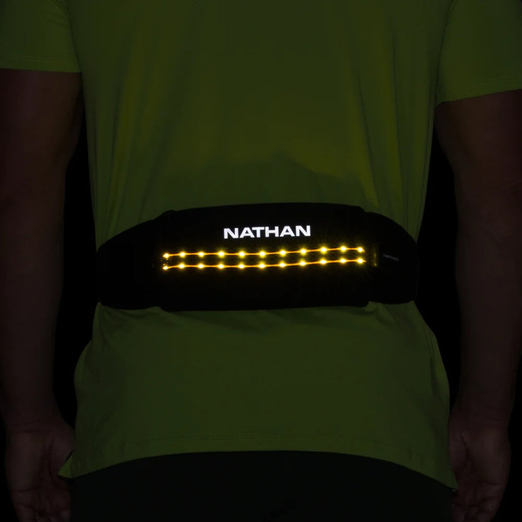 Light up your run with 8-lumen LED belt with roomy pockets—stay visible and hands-free. Be Seen: Ultra-lightweight, light-up neoprene adjustable storage belt to help you be seen in low light conditions. Storage For Essentials: two zippered pockets designed to fit most smartphones and small valuables. Rechargeable Battery: Includes C to A port charging cord.