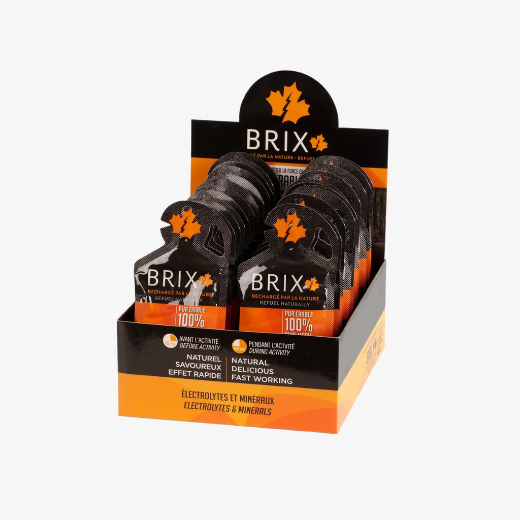 BRIX gels provide a source of energy easily absorbed by your body. Using no more than 3 ingredients per gel, all of which are 100% natural including Canadian Maple Syrup, Himalayan salt, and fresh fruit concentrate.